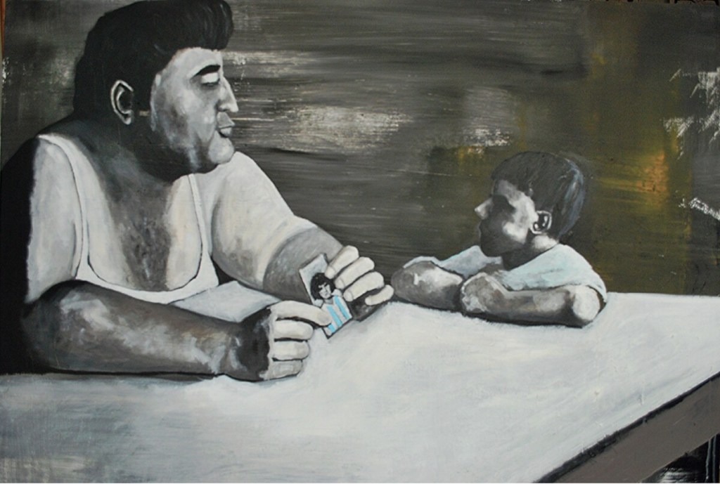 La obra de Luca De Risio tiene unos cuantos años. Cuando la conocí, lo que primero me conmovió fue el sentido de transmisión, no solo en su ideario popular, más bien como condición de conversación, una conversación en la que uno sabe que está entregando a otro algo precioso, un poco propio, otro ajeno, algo universal, pero que tiene mucho de uno y para uno. Tal vez por eso, al hombre lo alcanza cierto halo de esa luz que cae sobre la imagen de Diego, pero el niño queda bajo sombra, una sombra que en nuestro observar va oscureciendo más y más. Aunque algo brilla allá en el fondo entre pinceladas color sol.