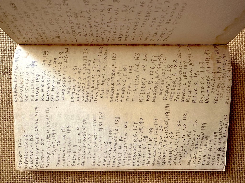 1. Hace unas semanas, en el inicio de X, me topé con un tweet de @borovinsky: “Compré un libro usado de Hans Mayer y el dueño anterior, que no subrayó ni una página del libro, hizo en lápiz un índice onomástico atrás de todo”. El tweet estaba acompañado por unas fotos que permitían ver en detalle la delicadeza con la que se llevó a cabo la labor. Se lo envié por Whatsapp a mi querido editor Leandro Donozo, un apasionado de estos índices. Primero expresó su encantamiento, luego la pregunta retórica: “¿cómo habrá ido a parar un ejemplar así a una librería de usados?”.
