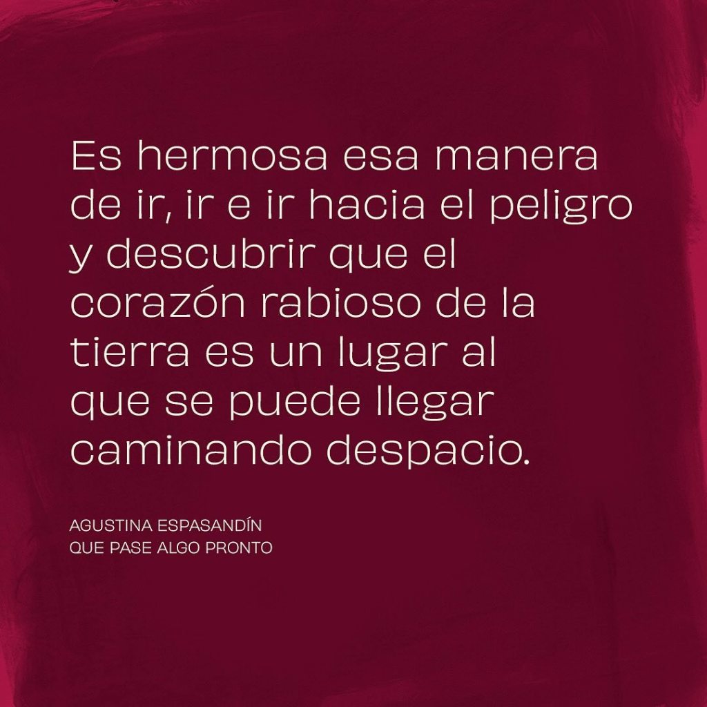 “Quería no tener nada que hacer, pero sobre todo, no tener que hacer nada que no quisiera” es lo primero que nos cuenta la protagonista de Que pase algo pronto, la primera novela de Agustina Espasandín. Luego de trabajar “durante meses y meses sin parar en distintos rodajes como asistenta de producción y a veces de dirección”, juntó “la plata suficiente para aguantar” y parar. No hablamos de tomarse vacaciones, de un descanso o año sabático, hablamos de una decisión más desordenada, experimental: “Ahora que el tiempo es todo mío, que no hay actividades ni horarios a los que acompasar el resto de un día, y lo que queda por delante se puede parecer tanto o no a lo anterior, veo cosas en donde antes no veía nada”.