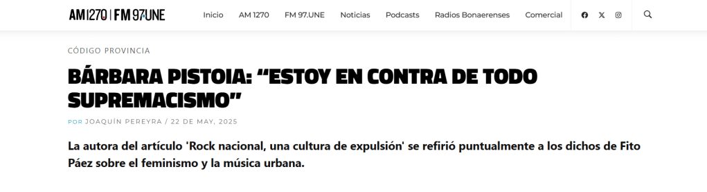 En diálogo con el programa Código Provincia, Bárbara Pistoia hizo alusión a los dichos de Fito Páez sobre los feminismos y señaló: “Estoy en contra de todo supremacismo y siempre he notado ese supremacismo en el rock. No solo frente a otros, sino con los propios. Es muy fácil salir en la Rolling Stone o sentarte con tu ex a decir cualquier barbaridad, están diciendo un montón de barbaridades en un contexto que es muy loco”.