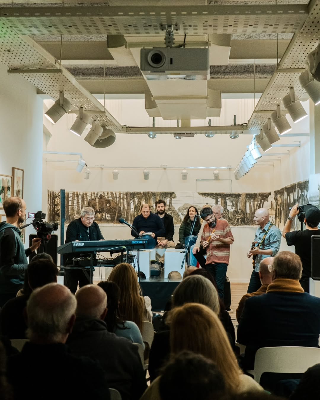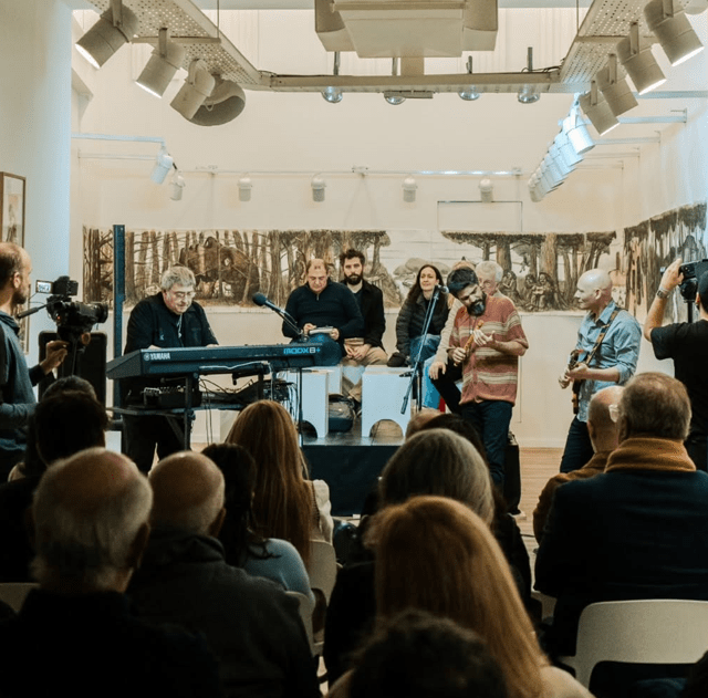 La sala musical de Contraviento todavía está envuelta por “Panorama de Rosario”, la línea de tiempo sublime que creó Daniel Santoro para dialogar un poco con el asunto del tricentenario local, pero sobre todo para exponer por primera vez una visión de la ciudad desde su perspectiva. Esa línea de tiempo también pone en diálogo el pre y el posfuturo. Como en un tercer plano, los invitados fueron acomodados en un símil 360, desordenando la visión habitual de escenario y público, de hecho, sobre el escenario había sillas para los asistentes. El trío se acomodó en el medio. Hacia un lado y hacia el otro, la mitología del pintor transmutaba y desde una esquina, por esas casualidades divinas de la exposición, La Trova Rosarina también asistía a la magia de su amigo y colegas.